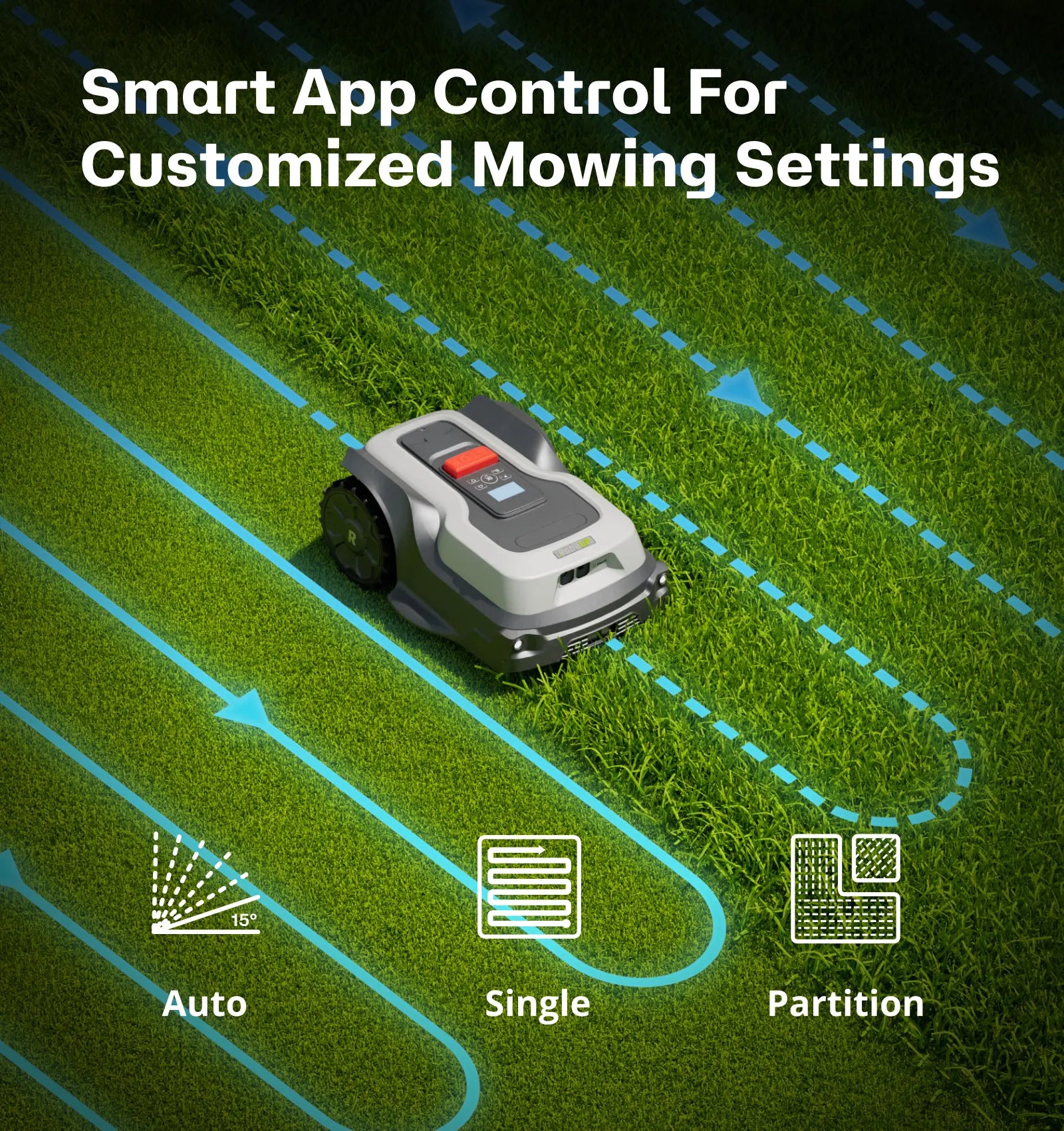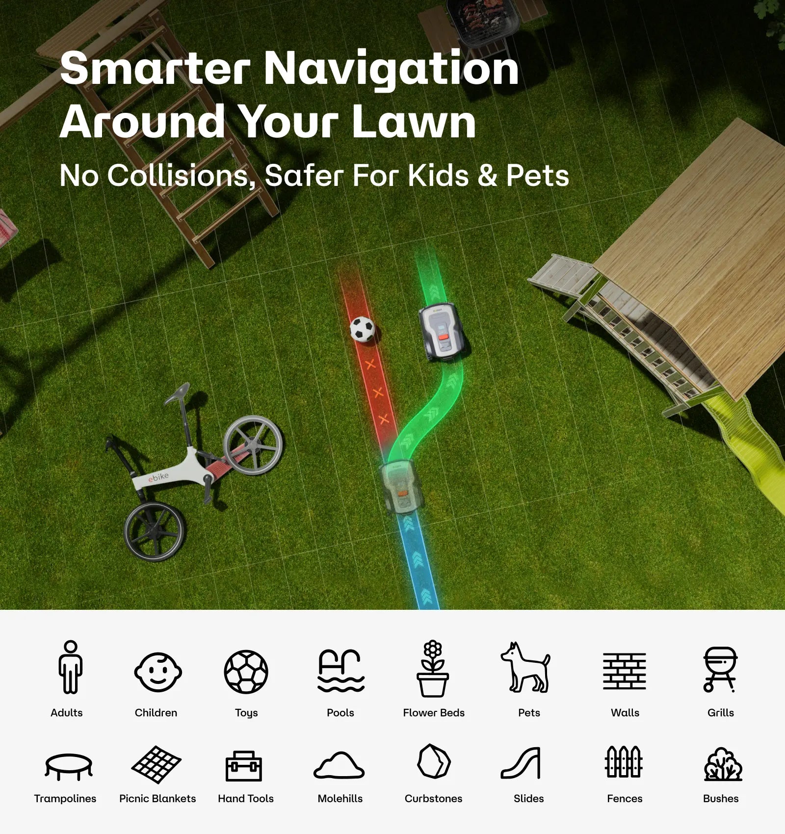 RoboUP's advanced AI can identify common garden objects like trampolines and barbecues, allowing the mower to smoothly navigate around them. This intelligent collision avoidance keeps your garden's layout intact and free from damage.